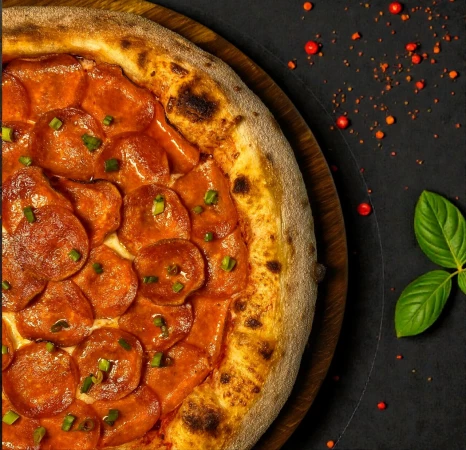 Тесто для пиццы, соус на основе томатов, пепперони, сыр моцарелла